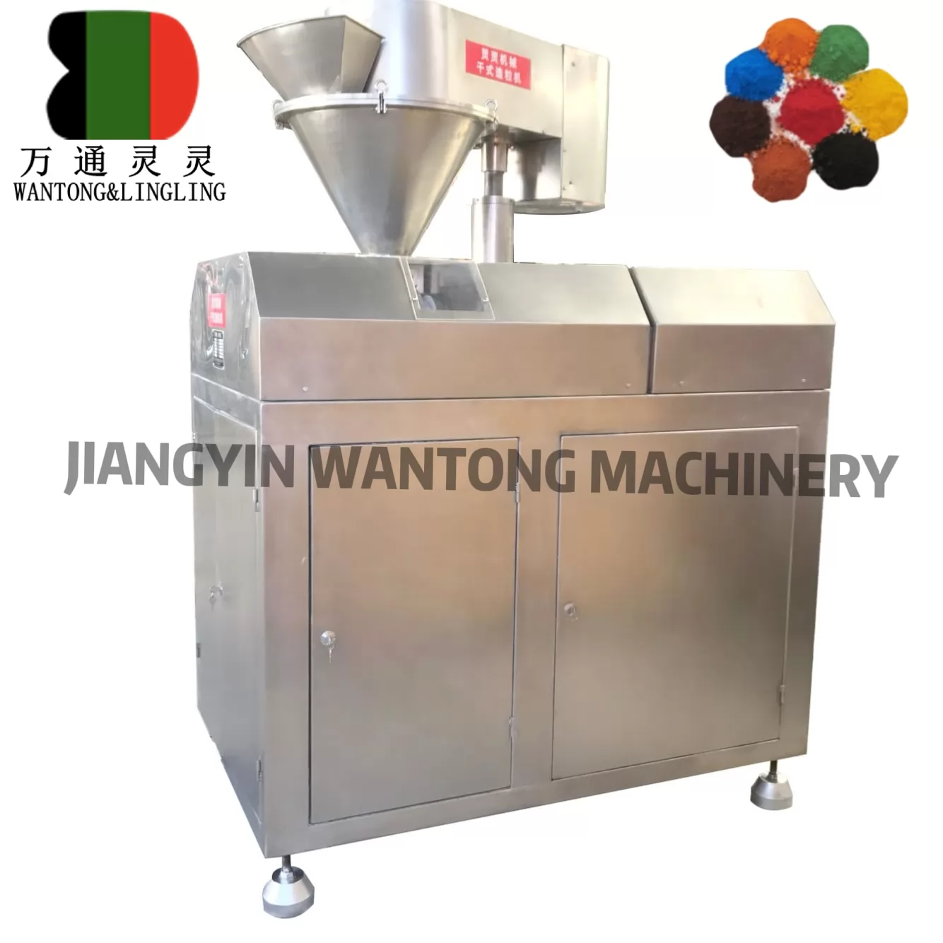 This dry granulator for pigment can be made into granule compressible tablets, granules, capsules, etc., especially suitable for granulation of materials that can not be solved by wet method.